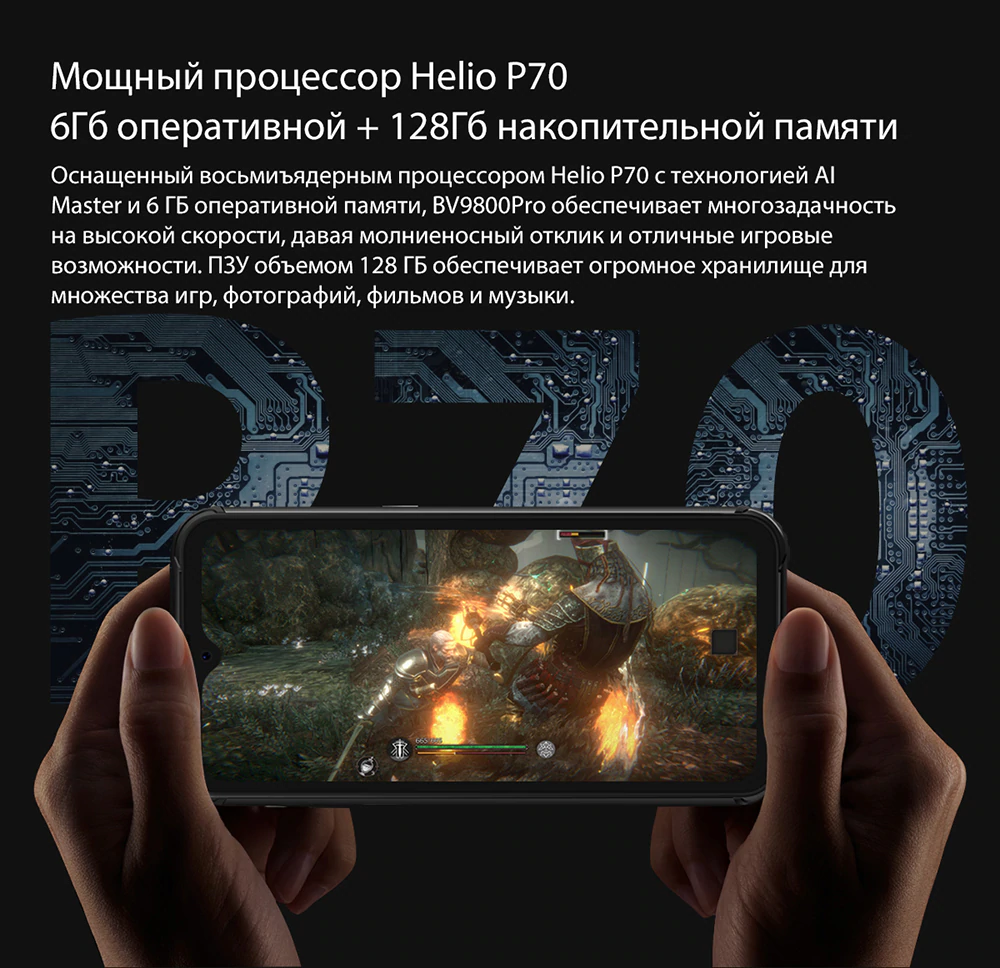Оснащенный 8-ми ядерным процессором Helio P70 с технологией AI Master и 6 Гб оперативной памяти Blackview BV9800 Pro обеспечивает многозадачность на высокой скорости, давая молниеносный отклик и отличные иигровые возможности. ПЗУ объемом 128 Гб обеспечивает огромное хранилище для множества игр, фотографий, фильмов и музыки.