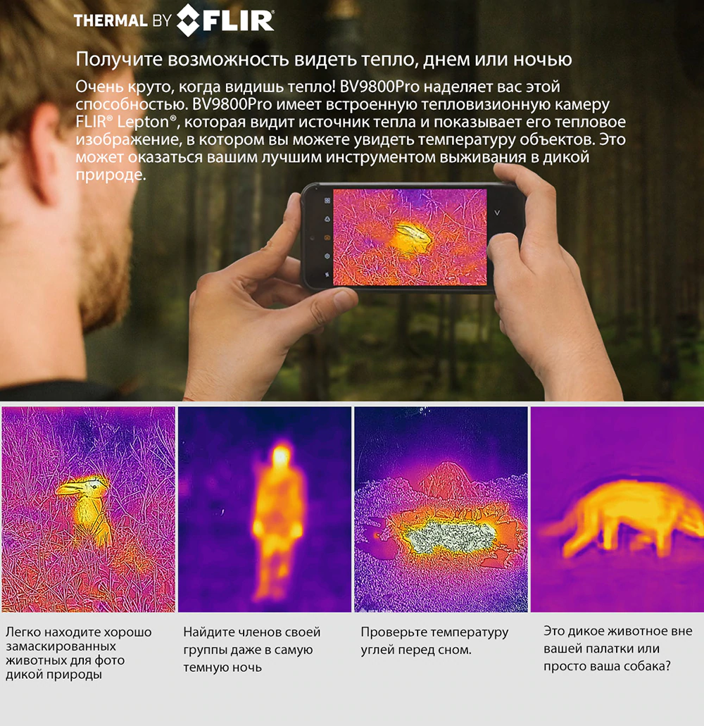 Возможность видеть тепло, днем или ночью. Очень круто когда видишь тепло! BV9000Pro наделяет вас этой способностью. BV9000Pro имеет встроенную тепловизионную камеру FLIR Lepton, которая видит источник тепла и показывает его тепловое изображение, в котором вы можете увидеть температуру объектов. Это может оказаться вашим лучшим инструментов выживания в дикой природе.