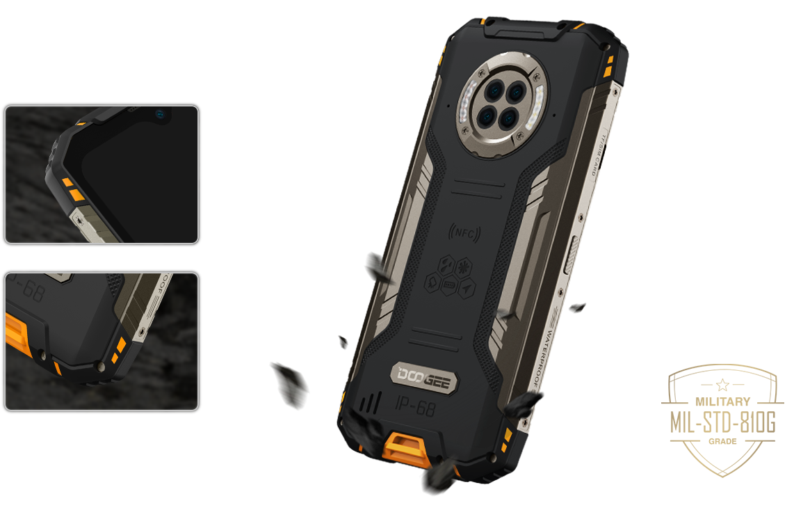 DOOGEE S96 Pro, виготовлений з м'якого ТПУ і посиленого алюмінієвим сплавом полікарбонату, може повністю захистити себе від сильних зіткнень, перекочування і скручування. Крім того, чотири посилених кута і збільшені рамки навколо екрану запобігають падінню в складних умовах, будь то будівельні майданчики, ферми або екстремальні зовнішні умови. S96 PRO має всебічний захист, що забезпечує неперевершену міцність і надійність на 360º.